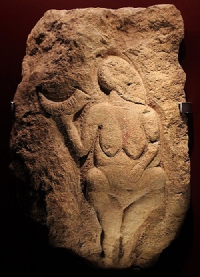Типово палеолітичний силует жінки має в руці рог для пиття, піднесний до рота.
